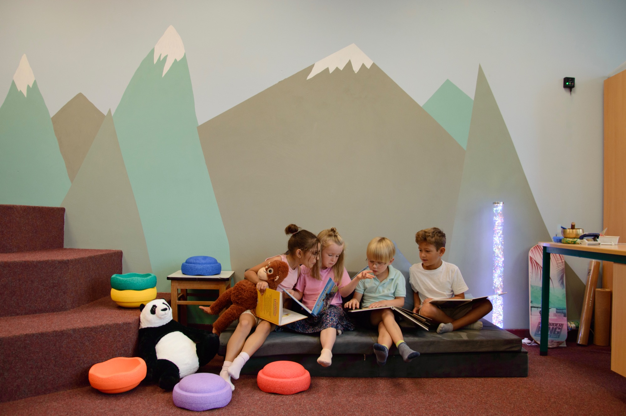 In unserem Leseraum befindet sich unsere Schulbibliothek. Hier besteht die Möglichkeit Bücher auszuleihen oder auch in ruhiger Atmosphäre zu lesen. Desweiteren lernt und fördert unsere Sonderpädagogin Frau Wurm in diesem Raum Kinder in Einzel- und Gruppenarbeit. Der liebevoll eingerichtete Raum lädt einfach zum Lernen ein.